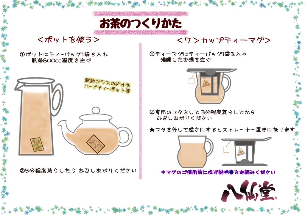 ポットにお湯を注いで3~5分程度蒸らすだけで美味しくお飲みいただけます。